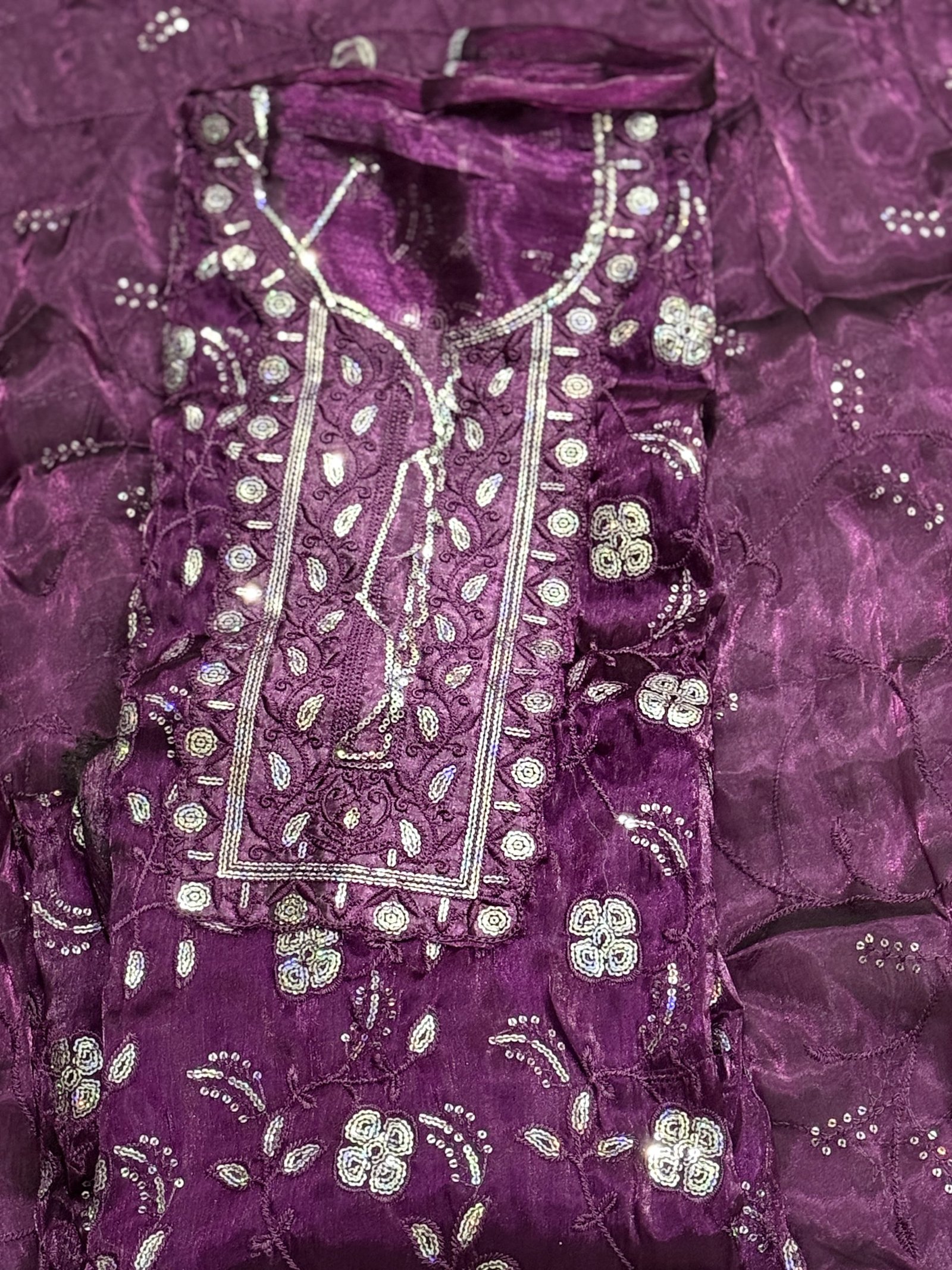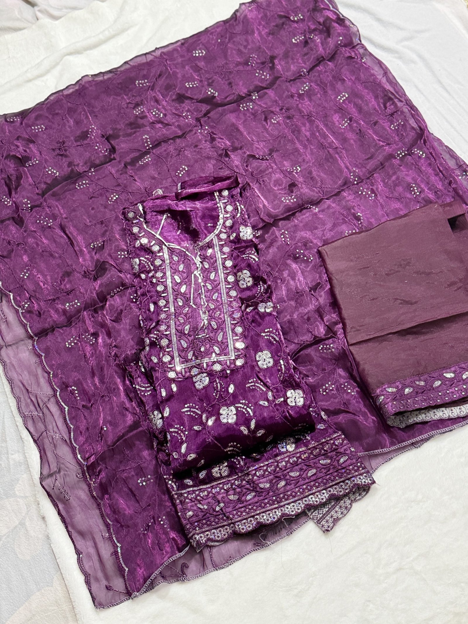 গাঢ় বেগুনি (Deep Purple) রঙের এই আনস্টিচড থ্রি-পিস সেটটি আপনার উৎসবের লুককে দেবে এক রাজকীয় ছোঁয়া।